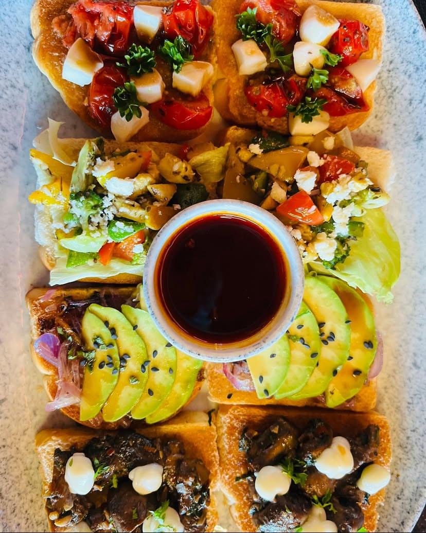 (Tortilla chips, beans, melted cheese, assorted cheese, BBQ Sauce, Jalapenos, pickled onions, salsa, guacamole and sour cream)