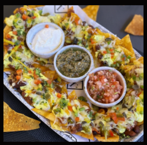 (Tortilla chips, beans, melted cheese, assorted cheese, BBQ Sauce, Jalapenos, pickled onions, salsa, guacamole and sour cream)